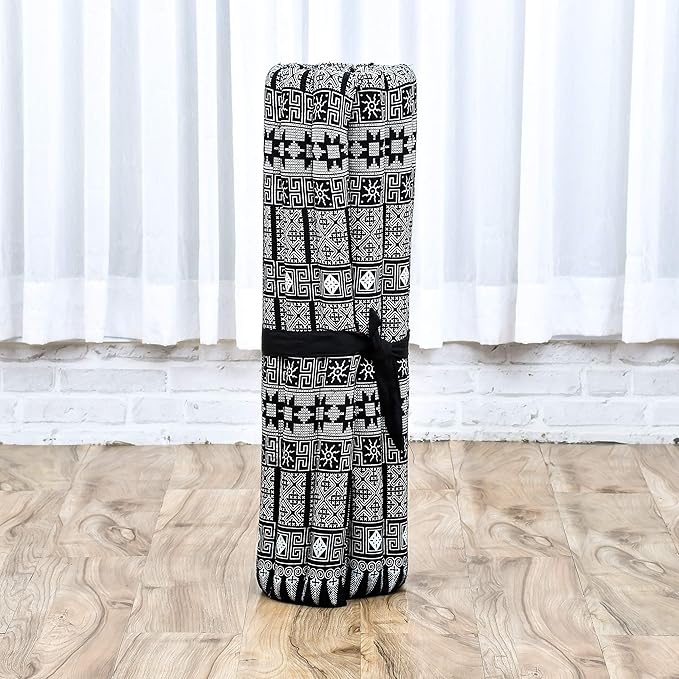- Contents: The yoga meditation mat measures 28 x 28 x 2 inches (WxDxH) when spread out. After use, it can be rolled-up for storage and transport. The rolled-up mattress measures 28 x 8 x 8 inches (WxDxH)