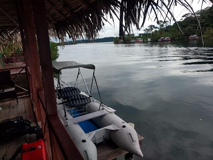 - Features: High-pressure inflatable air deck floor is very stable . you can stand ,walk or even jump on it, the same way you could on hard floor. two air chambers per side-tube to make the boat more safer . Transoms covered with triangular splash guards to minimize back splash and protect the transom holders from heat and exposure to UV rays, one-way drain valve with plug, 4 ( four) fins for improved tracking.