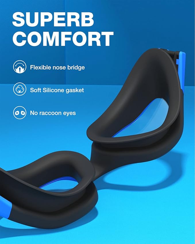 - [Comfortable Wearing] - This swimming goggles come with soft and flexible silicone gasket, adjustable split head strap, TPR ergonomic nose bridge, provides excellent suction and ensure non-slip coverage, that is designed to fit a wider range of face shapes for both women and men