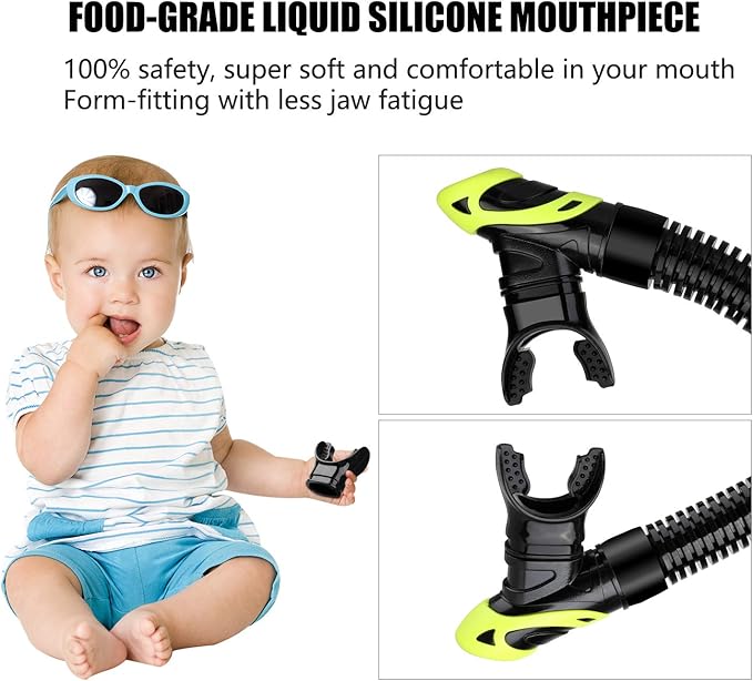 - Effortless Breathing with a Longer, Curved Tube: Our snorkel's larger-diameter oval upper tube delivers unrestricted airflow, letting you breathe naturally and comfortably. The curved design fits closely to your head, reducing drag and improving ease of movement—perfect for snorkeling, skin diving, scuba diving, and swimming.