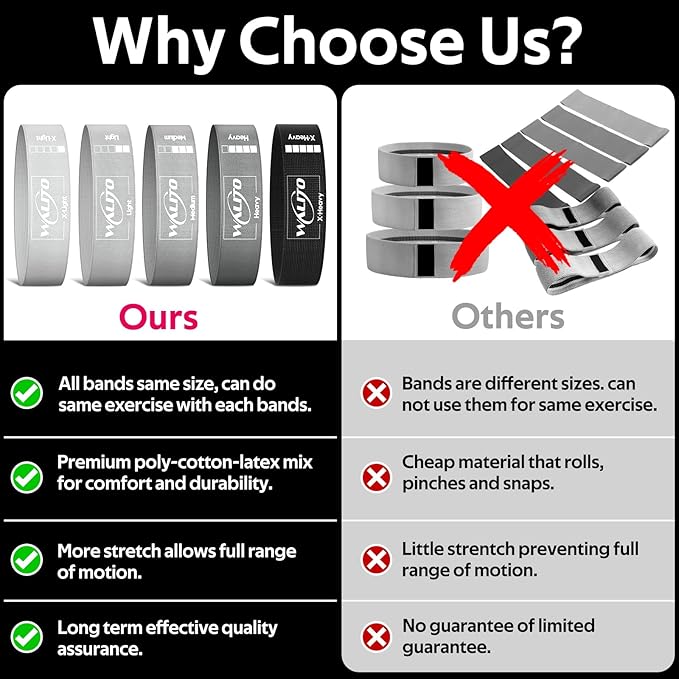 - [Set of 5 Resistance Levels] - workout bands resistance offer five different resistance levels ranging from light to x-heavy, suitable for all fitness levels. So, Never worry about the squat bands being too elastic or too small, your can easily switch between 5 levels according to your preferences at any time.
