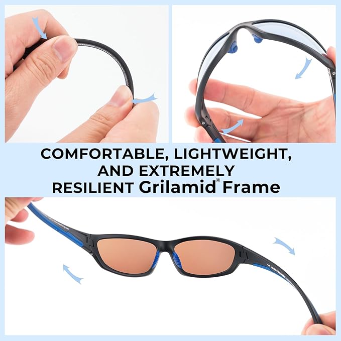• KEY FEATURES - Polarized lenses reduce glare - Impact resistant TAC lenses protect your eyes from flying objects - Lightweight, durable, and comfortable Grilamid frames – Anti-slip nose and temple pads - Block 100% of the harmful UVA and UVB rays