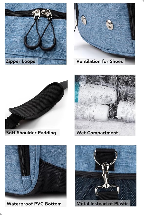 - 6 SEPARATE POCKETS: 1 spacious main compartment with a small inner pouch. 1 waterproof wet pocket, 1 breathable shoe pocket, 1 medium-sized front pocket, and 1 side mesh pocket.