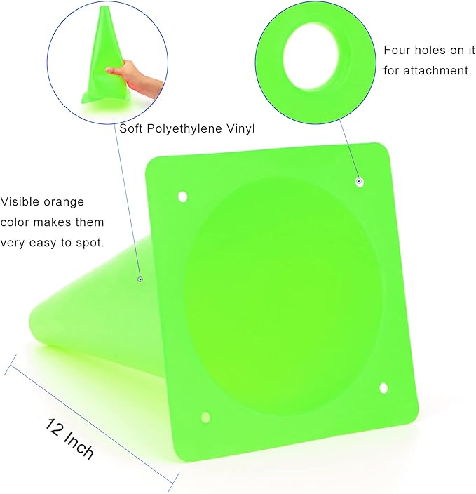 • Size - measures 12 inches in height, 6.7 inches in diameter. Four holes on safety cones for attachment, if it is a windy day, you do not need to worry it will blow all over the place.