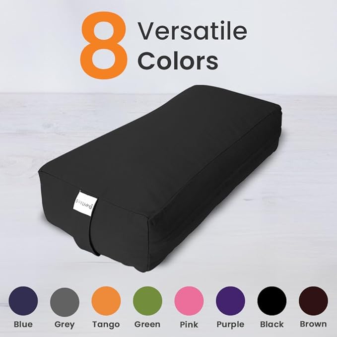 - Perfect Size and Color Meditation Bolster: Our rectangular bolster pillows come in two sizes, 28" x 12" x 8" and 26" x 8" x 5". This firm yoga pillow is available in grey, green, tango, brown, black, pink, purple, and navy blue.