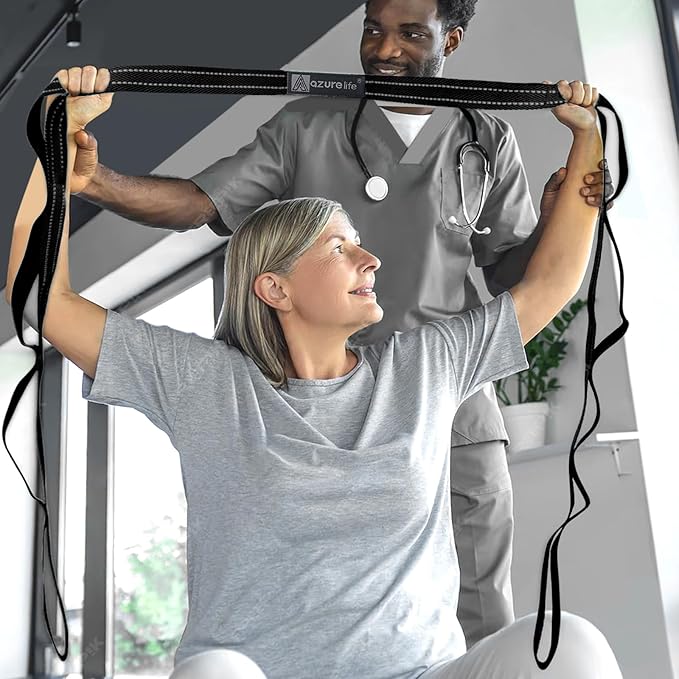 - 【BENEFIT】: Multiple hand-holds along the strap allows for progressive unassisted stretching with greater control. Use this stretch strap to prepare for daily activities, prevent injury, alleviate tightness, increase flexibility and improve range of motion.