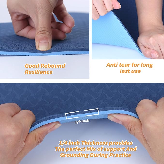 • 🧘‍♀️【Durable and Spacious TPE Yoga Mat】Our yoga beginners kit includes a premium TPE yoga mat with double-sided non-slip surfaces and two color options. Measuring 72"L x 24"W, it provides ample space and a 6mm (1/4in) thick for optimal comfort and support. The fast rebound technology reduces impact force, protecting your joints while maintaining stability.