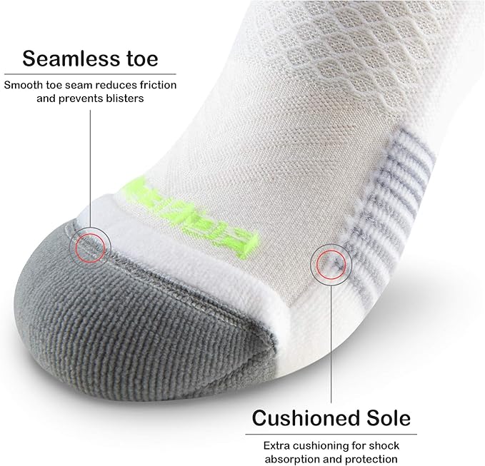 - Seamless Toe & Cushion Sole ??Prevents blisters and friction with a seamless toe seam and soft cushion sole that absorbs shock with every step.