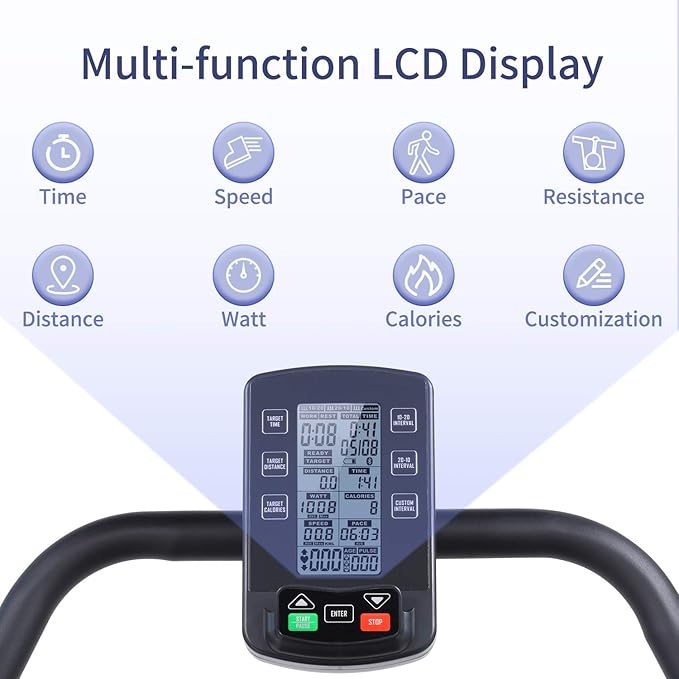 - LCD MONITOR-Curved treadmills for running equipped with a 5” mini LCD screen, which tracks your time, distance, calories, watt(energy consumption), speed, pace, load(resistance: L1-L4), help you record important data during exercise. There are also custom functions to help you achieve your sports goals.