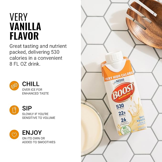 Boost Very High Calorie Vanilla Nutritional Drink – 22g Protein, 530 Nutrient Rich Calories, 8 Fl Oz (Pack of 24)