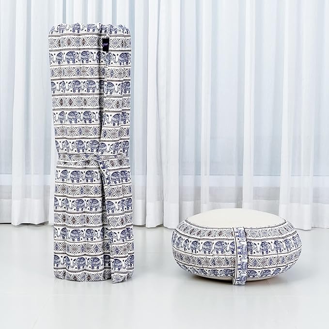 Leewadee Meditation Cushion Set – 1 Round Zafu Meditation Pillow and 1 Square Roll-Up Zabuton Meditation Mat, Pillows Bundle Filled with Kapok