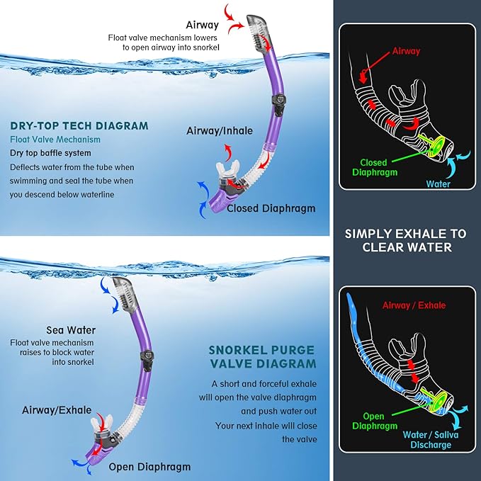 - Unobstructed breathing dry top snorkel: a high-quality snorkel with a dry-top valve that seals the breathing tube when submerged. dry top snorkel is designed to keep water from entering the breathing tube, ergonomic silicone mouthpiece is comfortable and durable. Lower purge valve allows water to be quickly expelled, so you can enjoy easy and unobstructed breathing while diving underwater.