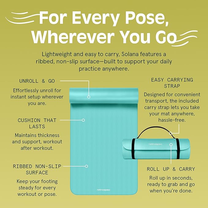 - EXTRA THICK FOR COMFORT & BALANCE: Solana firm 1-inch extra thick fitness mat w/ mat strap alleviates stress on pressure points such as joints, hips, hands, and knees. Solana measures 72" X 24" X 1".