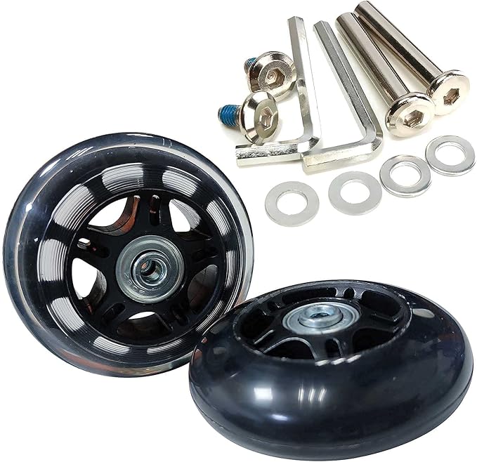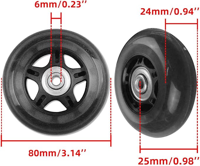 - [Wheels Size] Diameter Is 80mm/3.14", Wheel Width Is 24mm/0.94", Wheel Thickness + Bearing=25mm/0.98", Center Bearing Internal Diameter Is 6mm/0.24". See The Wheel Size In The Picture. (Please Note: Please measure the wheels on your luggage before buying to make sure the size you buy is the right size, if you are not sure whether it is appropriate, please feel free to contact us to help you confirm.)