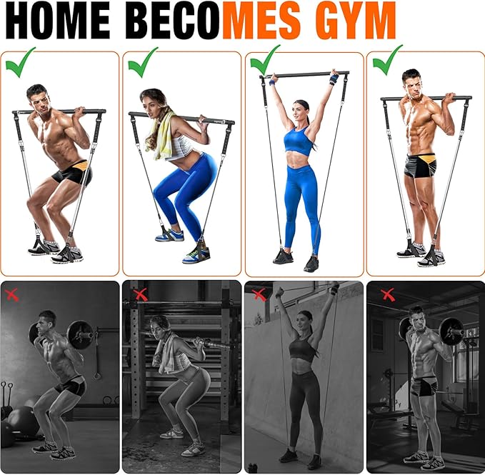 - All in 1-Full Body Workout- The workout equipment could help shape body,training muscles,etc.You can put these 2 kinds of resistance bands together on each side,if you want to increase the intensity of tension.Also,you can use the same weight resistant bands,attached to each side for light weight resistance.The 3 detachable steel rod could be assemble to the length when you training