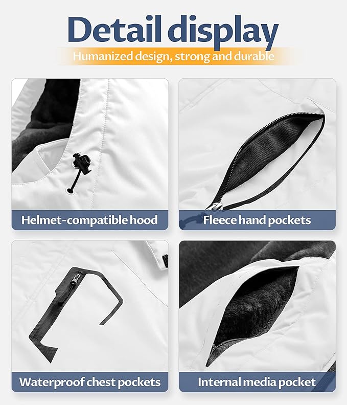 • ❄ Functional Pockets--Snowboarding jacket with waterproof chest zipper pocket(ski pass pocket), 2 zippered micro fleece handwarmer pockets. Internal media pocket with media port. Internal large pocket can put ski goggles, water glasses.