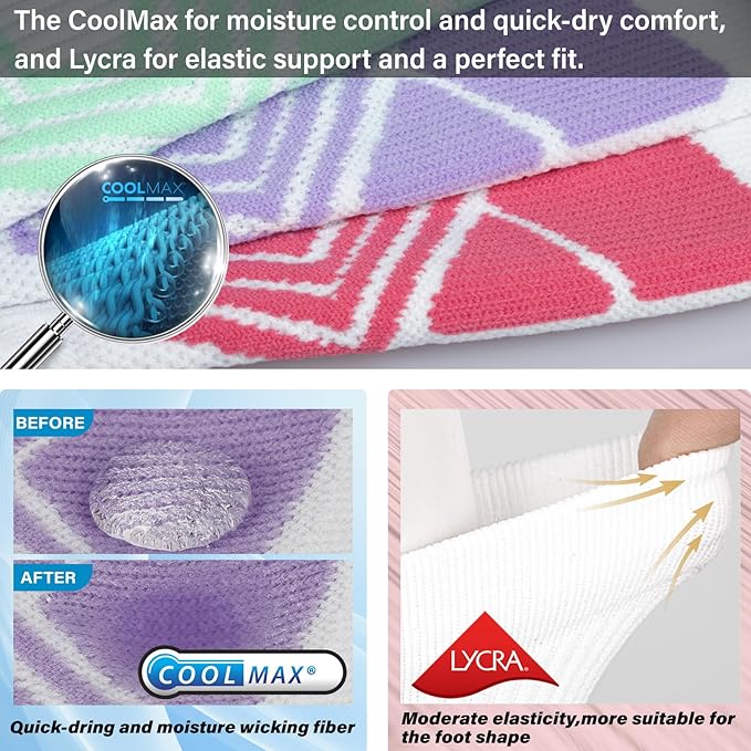 - [Moisture Wicking Socks] The cushioning in the heel and toe areas of these athletic quarter socks are made from high-end moisture control and quick-dry Coolmax fabric. Coolmax is a necessary material for making high-end sportswear. It may keep your feet dry, breathable and odor-free while doing exercises. If you need a pair of quick dry, anti odor fitness socks, this is your best bet