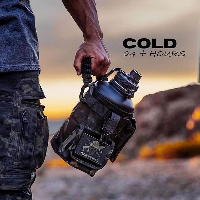 - PATENT PENDING DESIGN - This unique and original design is the only one of its kind. Iron Infidel created and patented this original design with our military, law enforcement, first responders , and hard working patriots in mind. These men and women put in long, hard days and a petite water bottle just won't cut it. Stay hydrated all throughout your hardest days, and you might as well do it with a bottle that looks cool. Grab the 21st century replacement of your old military canteen.