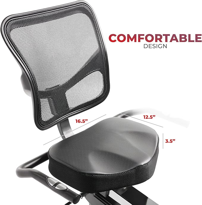 - 【 ADJUSTABLE ERGONOMIC SEAT WITH BREATHABLE MESH BACK 】 Enjoy optimal comfort with an easily adjustable, extra-padded seat and breathable mesh back, perfect for extended sessions on this recumbent bike.