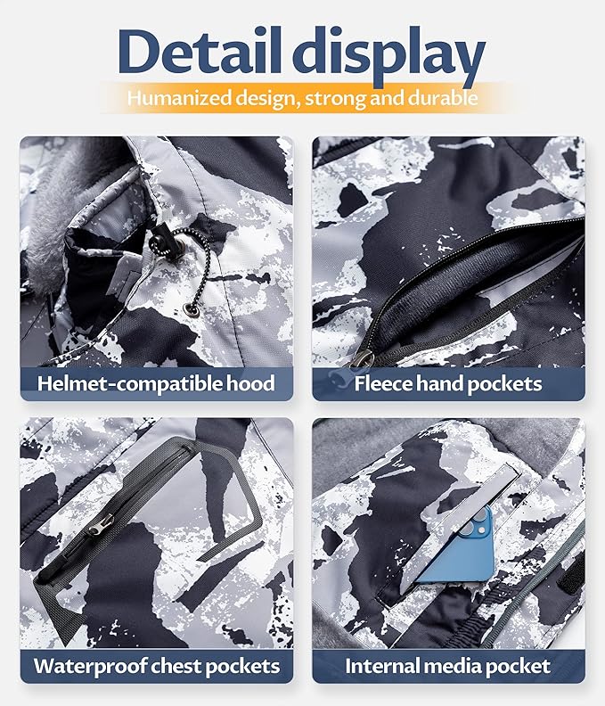 - ❄ Functional Pockets--Snowboarding jacket with waterproof chest zipper pocket(ski pass pocket), 2 zippered micro fleece handwarmer pockets. Internal media pocket with media port. Internal large pocket can put ski goggles, water glasses.