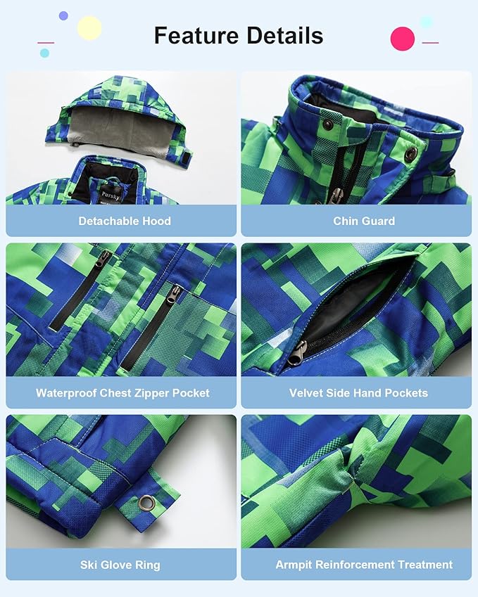 - ?�‚ Quality Details: 1. SBS smooth zipper. 2. helmet-compatible hood allows you to resist the cold wind during skiing, and will not let your kids' forehead get wet on rainy days. 3. 2 handwarmer zipper pockets and 2 chest zipper pocket can store keys, card and to prevent items from being lost in the snow. 4. well made and tailored with reinforced stitching.