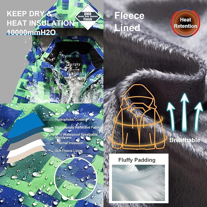 • ?�‚ Waterproof & Keep Dry: 10000mm waterproof rating composite film and water-repellent coating fabric can effectively keep body dry when your kids is playing in the snow. 5000g/m2/hr breathability index shell and moisture-absorbing down-alternative filling will keep dry after skiing.