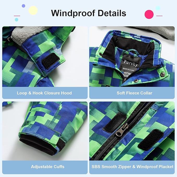 • ?�‚ Quality Details: 1. SBS smooth zipper. 2. helmet-compatible hood allows you to resist the cold wind during skiing, and will not let your kids' forehead get wet on rainy days. 3. 2 handwarmer zipper pockets and 2 chest zipper pocket can store keys, card and to prevent items from being lost in the snow. 4. well made and tailored with reinforced stitching.