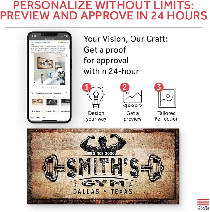 - You get a Preview with a Lifetime Warranty - Check your Personalized Gym Sign Wall Art Decor sent by our Quality Control Team within a day via Amazon Messaging; Love it or We'll make it right for you, no questions asked! Click "Customized Now" & Lets turn your Ideas into Reality!