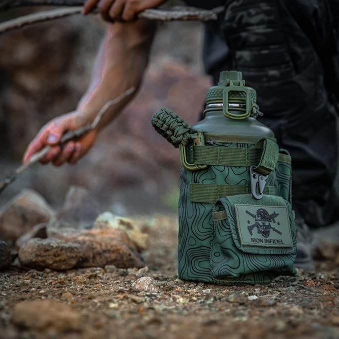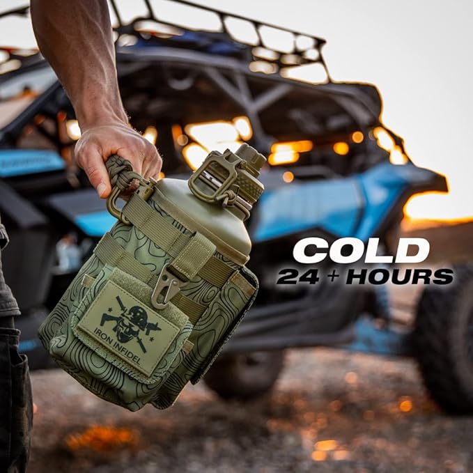 - PATENT PENDING DESIGN - This unique and original design is the only one of its kind. Iron Infidel created and patented this original design with our military, law enforcement, first responders , and hard working patriots in mind. These men and women put in long, hard days and a petite water bottle just won't cut it. Stay hydrated all throughout your hardest days, and you might as well do it with a bottle that looks cool. Grab the 21st century replacement of your old military canteen.
