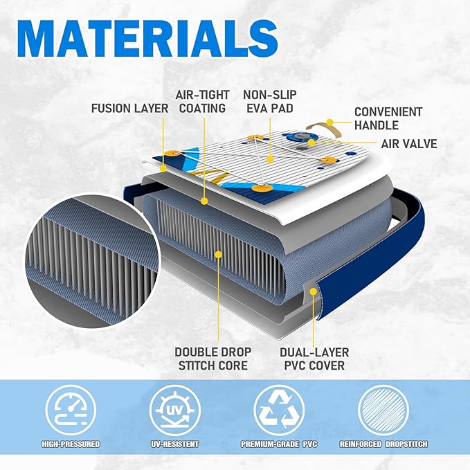 - 【Military-grade high-quality material】The board is made of new ultra-light military-grade PVC material, which is 35% lighter than ordinary materials, which gives you a better user experience. The non-slip EVA pad in the middle ensures enough friction between your feet and the board, especially during fast rowing, making it safer.