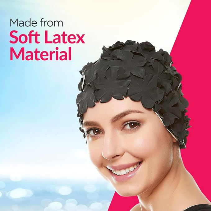 - SWIM CAP: The Beemo Women’s Latex Floral Petal Cap is constructed using soft and stretchy latex with a special rubber seal to protect ears from getting filled with water and defend your hair from damage.