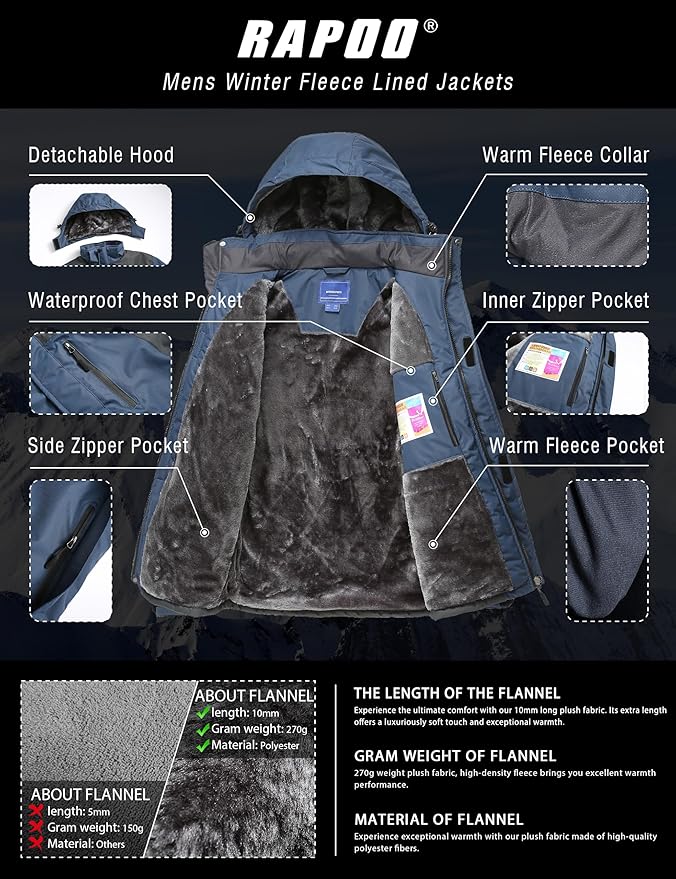 • Waterproof & Quick Dry Winter Coats for Men: Our winter jacket with a professional water repellent coating and has a waterproof level of 10000mm. The zippers are also waterproof, so you don't have to worry about getting wet while skiing, snowboarding, or in rainy weather.