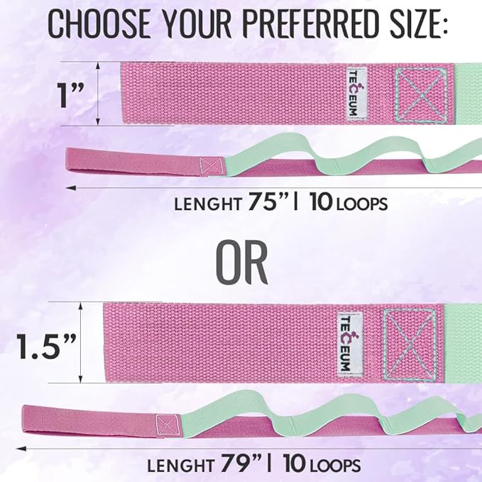 - STRETCHING STRAP. Color: LAVENDER GREEN. Material: POLYCOTTON. Width: 1 IN. Length: 75 IN. 10 Loops. Non-elastic. Superior Non-slip Grip.