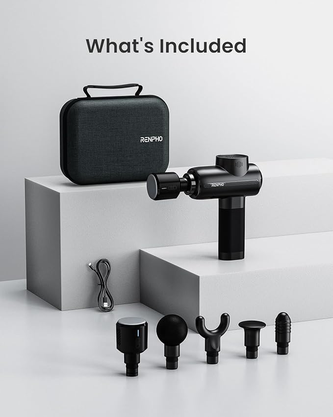 - Hot and Cold Therapy: Renpho Massager gun deep tissue with Heat comes with a heating and cooling massage head(No built-in battery) that can heat up to 113 °F (45 °C) or cool down to 47 °F(8 °C) for deeper muscle relaxation and stress relief