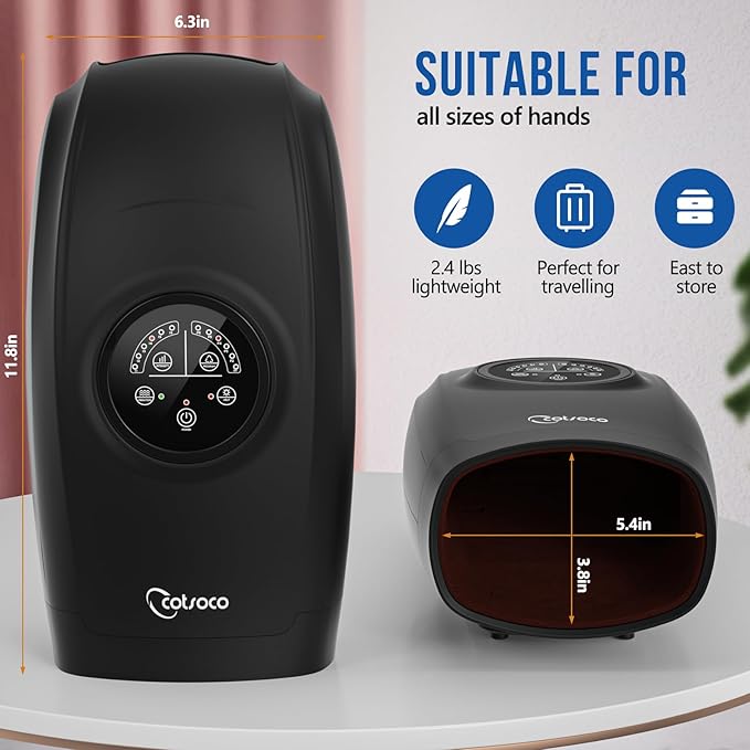 - EFFECTIVE MASSAGE: Five precise pressure points are designed inside the Cotsoco Electric Hand Massager. By pressing the upper and lower airbags on your hand, it can effectively stimulate the acupoints on your hand, relieve your hand fatigue, and relieve muscle soreness. Ideal for arthritis, carpal tunnel and pain relief.