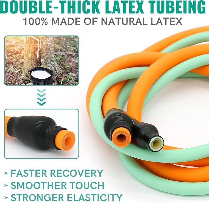 - THE LATEST UPGRADED 150LBS RESISTANCE BANDS: Our resistance bands for working out are made of 100% healthy and environmentally friendly natural latex material, which have smoother touch, stronger resistance and better wear resistance! The exercise bands resistance have 5 different strength levels, corresponding to 5 different colors (cyan 10 lbs, blue 20 lbs, red 30 lbs, orange 40 lbs, purple 50 lbs), which can be used alone or stacked in any combination to a maximum equivalent of 150 lbs
