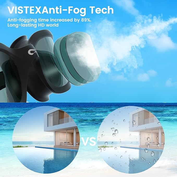 • 【VISTEX ANTI-FOG TECHNOLOGY FOR SWIMMING GOGGLES HD】Our adult swim goggles feature industry-leading VISTEX anti-fog technology, which far exceeds the anti-fog performance of traditional swim goggles with an innovative coating that extends anti-fog time by 89%. Not only does it effectively stop water vapor condensation, but it also maintains its performance after multiple uses, ensuring a clear, fog-free view during every swim