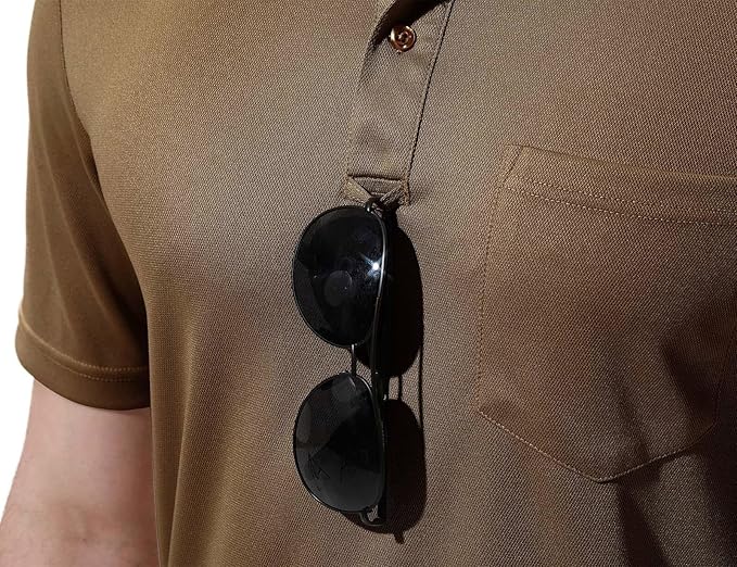 • Classic golf polo shirts with 2-button placket and lapel collar; a loop at the end of the collar opening for glasses or pen