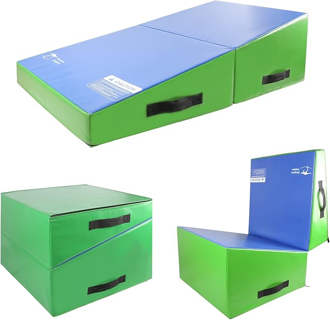 - FOLDABLE DESIGN WITH 4 HANDLES, EASY TO CARRY & STORE: Each side and every handle with excellent craftsmanship will never unravel. Simply turn the gymnastics mat from a cube to a wedge or from a wedge to a cube by opening and folding it. You can take the incline mat with you to the backyard, park, or gym and store it at any place in your house when not in use.