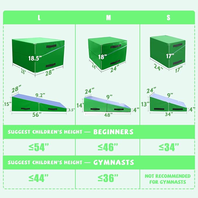 - COMFORTABLE & FIRM STUFFING BRINGS ETERNAL SECURITY: Kangaroo Hoppers cheese mat is dedicated to safety. Folded size of L: 28"x28"x18.5"(L x W x H). Unfolded size 56"x28"x15" (L x W x H). Suggested children’s height is shorter than 54". Suitable for young gymnasts and allows for a variety of skills training. You feel stable and comfortable on this gymnastics wedge mat. And high-density EPE foam won’t go out of shape after long-time use.