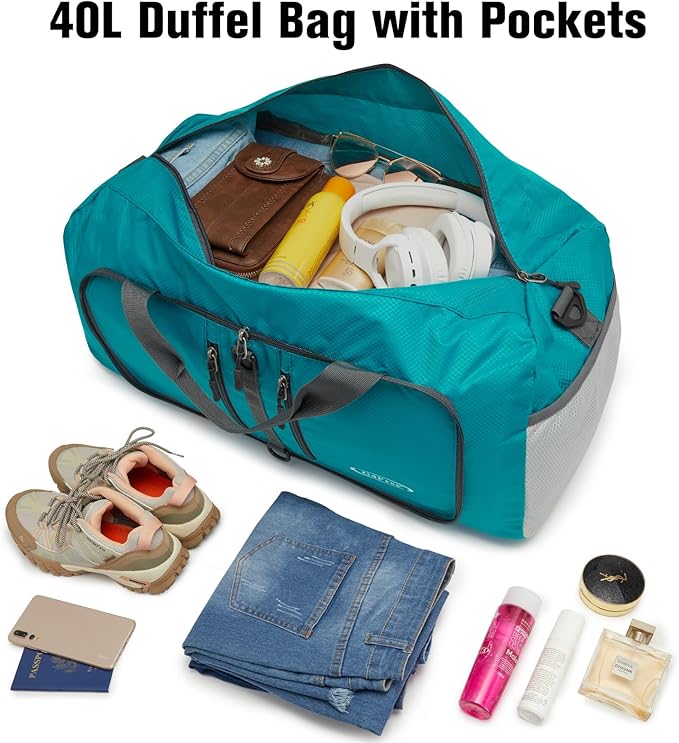 - Large Capacity for Easy Store - 40L Travel duffel bag folds up super small size, while extends to 21.6 x 8.6 x 12 inches and use as a luggage bag in case that your suitcase swells. Just take it for your airline trips as it obeys airline personal item size. Perfect for easy storing in any size yoga locker.