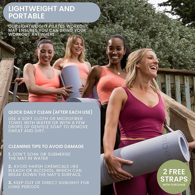- EFFORTLESSLY PORTABLE: Our lightweight pilates workout mat ensures you can bring your workout anywhere. Included with your purchase are 2 storage straps, making transport and storage a breeze, for fitness that follows you