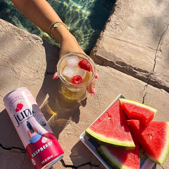 Juni Sparkling Adaptogen Drink with Ashwagandha, Lion’s Mane & Reishi Mushrooms | Green Tea for Focus, Zero Sugar, 5 Calories, Organic | Non Alcoholic Drinks - Raspberry 12 pack