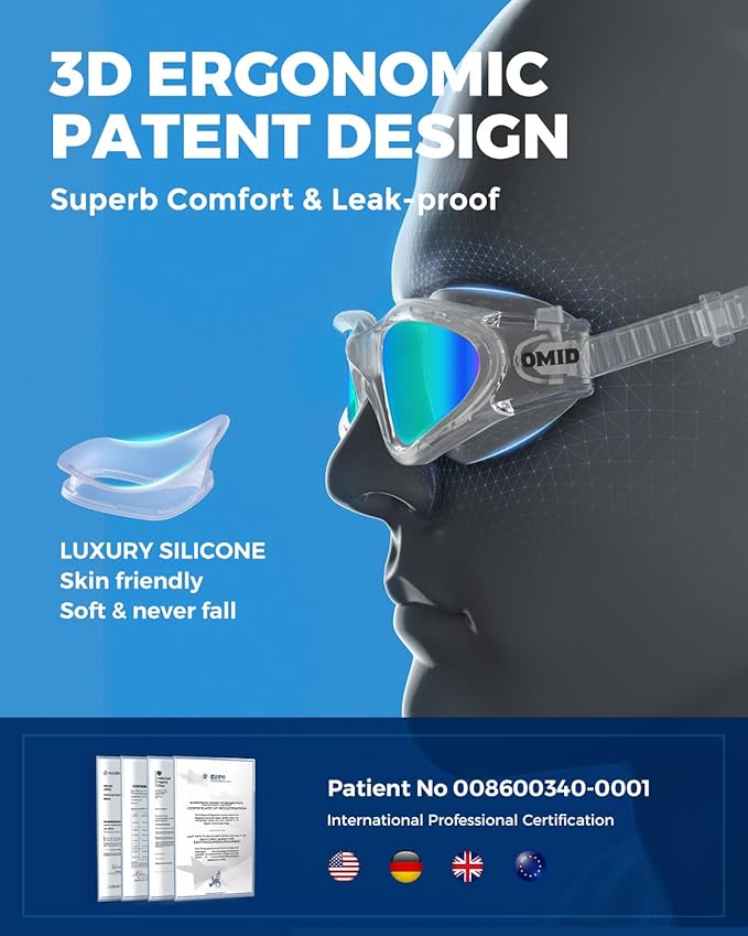 - 【Professional Leak-proof & UV Protection】Our swimming goggles for men designed with Ergonomic 3D frame ensures a perfect fit and never allows water leak in. In order to protect your eyes from irritation. OMID swim goggles are constructed with 111% UV protection to filter out harmful rays, which will bring you worry-free, crystal clear swims every time.