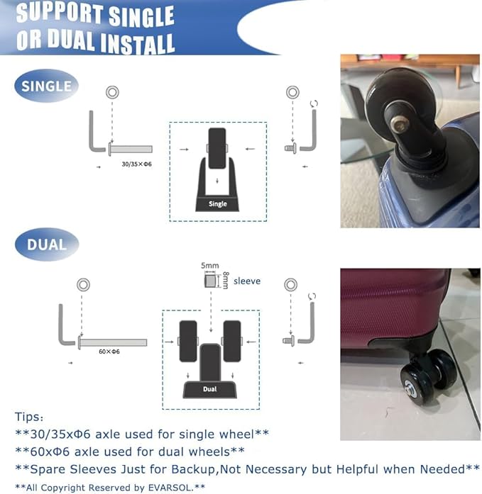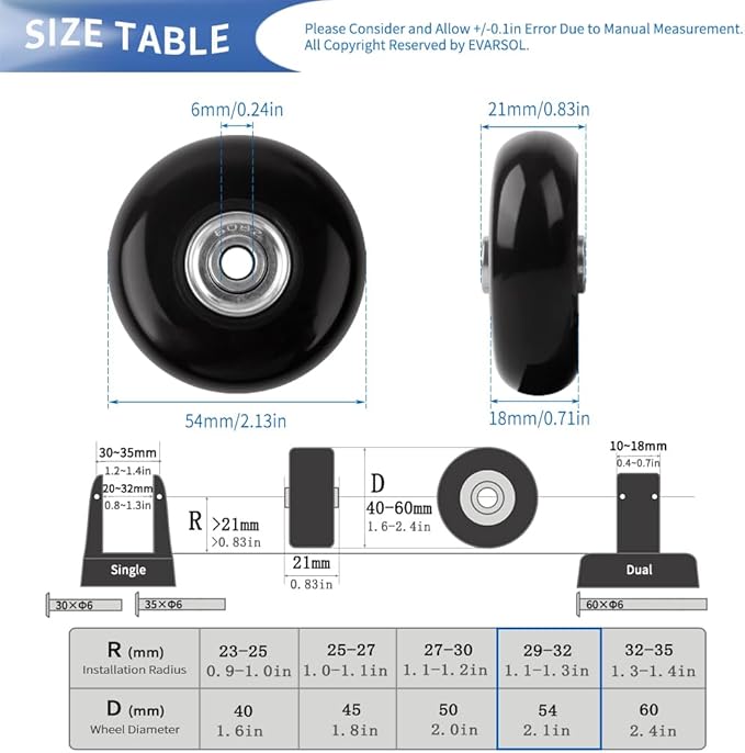 - Widely applications:Fix for most luggage suitcase/trolley case/duffle bag/drawbar box with damaged/jammed/rubber worn wheel replacement repair,but also for replacing inline roller skate wheels