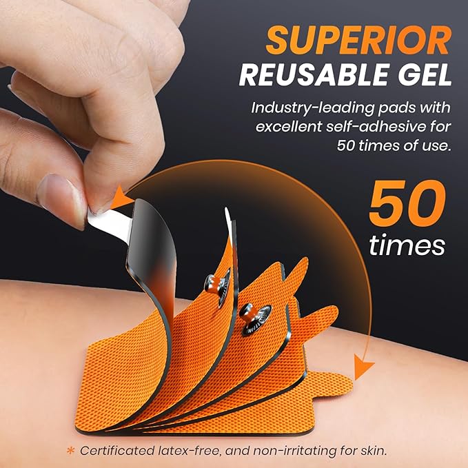 - Multi-shape Pads Combination: Experience targeted relief with 2 sizes of pads of the stim machine. Small pads target areas such as the neck, knee, and ankle; larger pads focus on the shoulders, waist, and thighs. These upgraded pads are made of latex-free gel for more than 50 times of use without skin irritation and are fully compliant with CE, RoHS, and FDA standards.