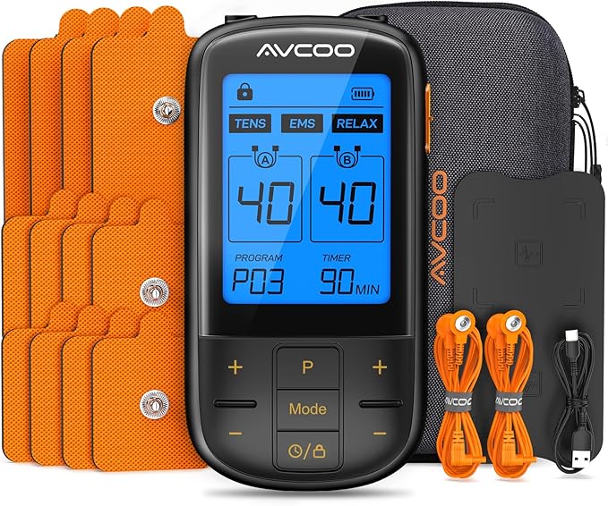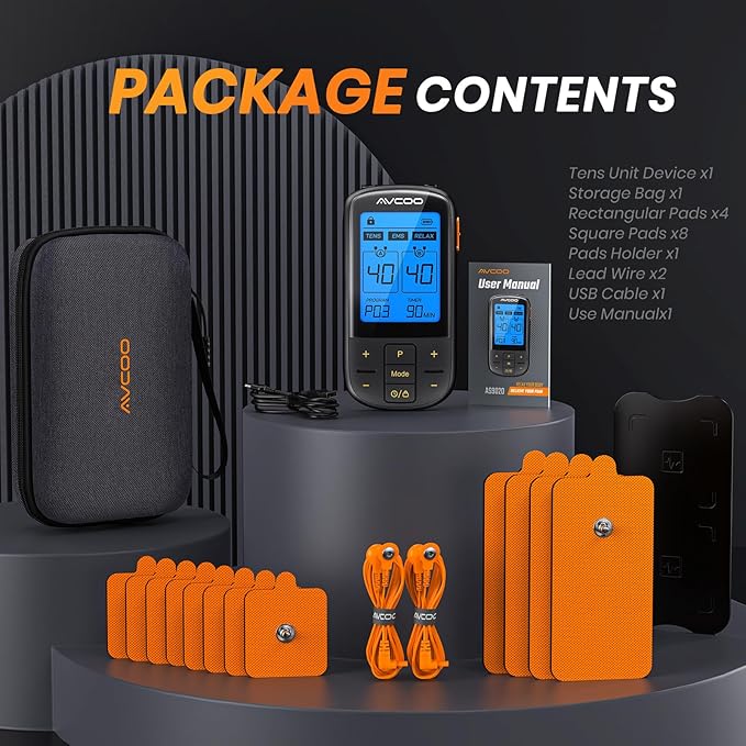 - Drug-free to Relax & Recover: AVCOO 3-in-1 multifunctional TENS machine combines TENS, EMS, and RELAX 3 therapies in one. The muscle stimulator can help relieve muscle soreness and pain in the elbow, shoulders, back, knees, arms, legs, sciatica, and pelvic zone. If you have chronic or acute pain, just try AVCOO TENS massager for relief