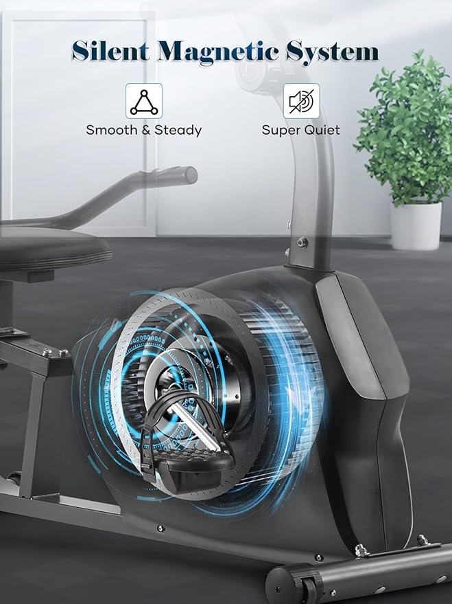 - 8 Level Magnetic Resistance: With 8 levels of resistance this recumbent exercise bike gives you different exercise intensity options, giving you the flexibility to tailor your workout to your fitness level.The recumbent exercise bike is ideal for casual ride. The movement that engages the whole body, virtually anyone to start a comfortable and low-impact workout, especially seniors and deconditioned people