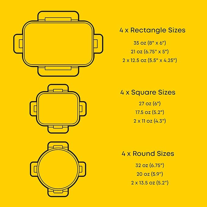- 12 SIZES FOR EVERY NEED: Our airtight food storage containers with lids set includes 4 rectangle containers 35oz (8x6"), 21oz (6.75x5"), 12.5oz (2x 5.5x4.25"). 4 square containers 27oz (6"), 17.5oz (5.2"), 11oz (2x 4.3"). 4 round containers 32oz (6.75"). 20oz (5.9"),13.5oz (2x 5.2").