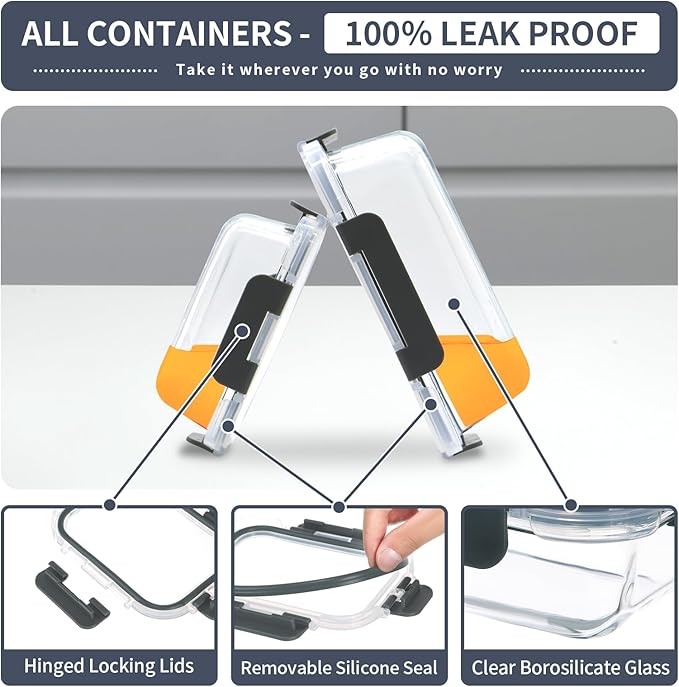 - 【100% Leak Proof Airtight Lid】Glass food containers is designed with removable silicone seals and 4-hinge snap locks to ensure zero leaking or spilling, which also prevent smell go out and keep food fresh.